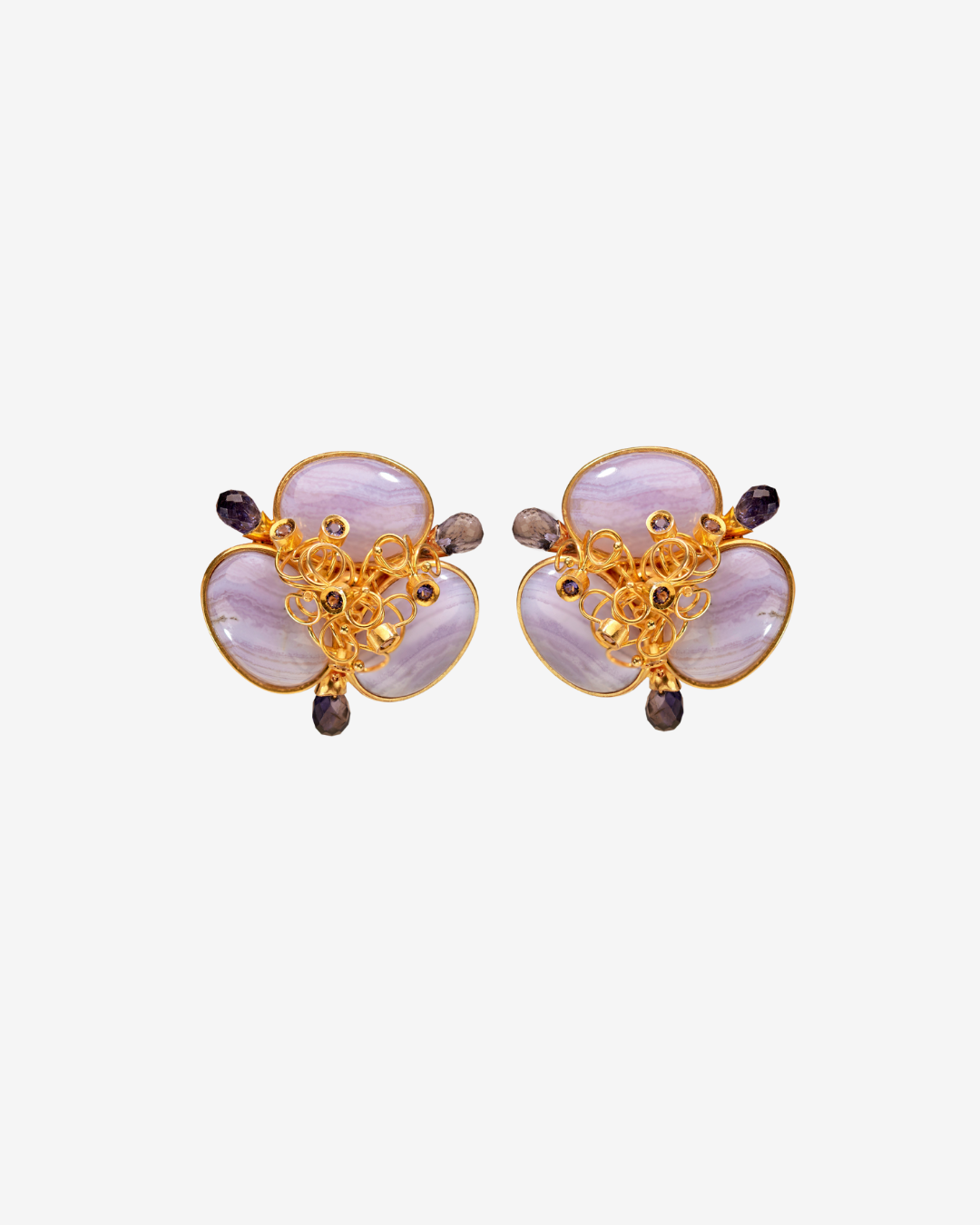 Indulge in luxury with these Gigi Earrings. Crafted with vermeil and adorned with three stunning blue chalcedony and iolite cabochons, these earrings are a true work of art. Elevate any look with their sophisticated and exclusive design.