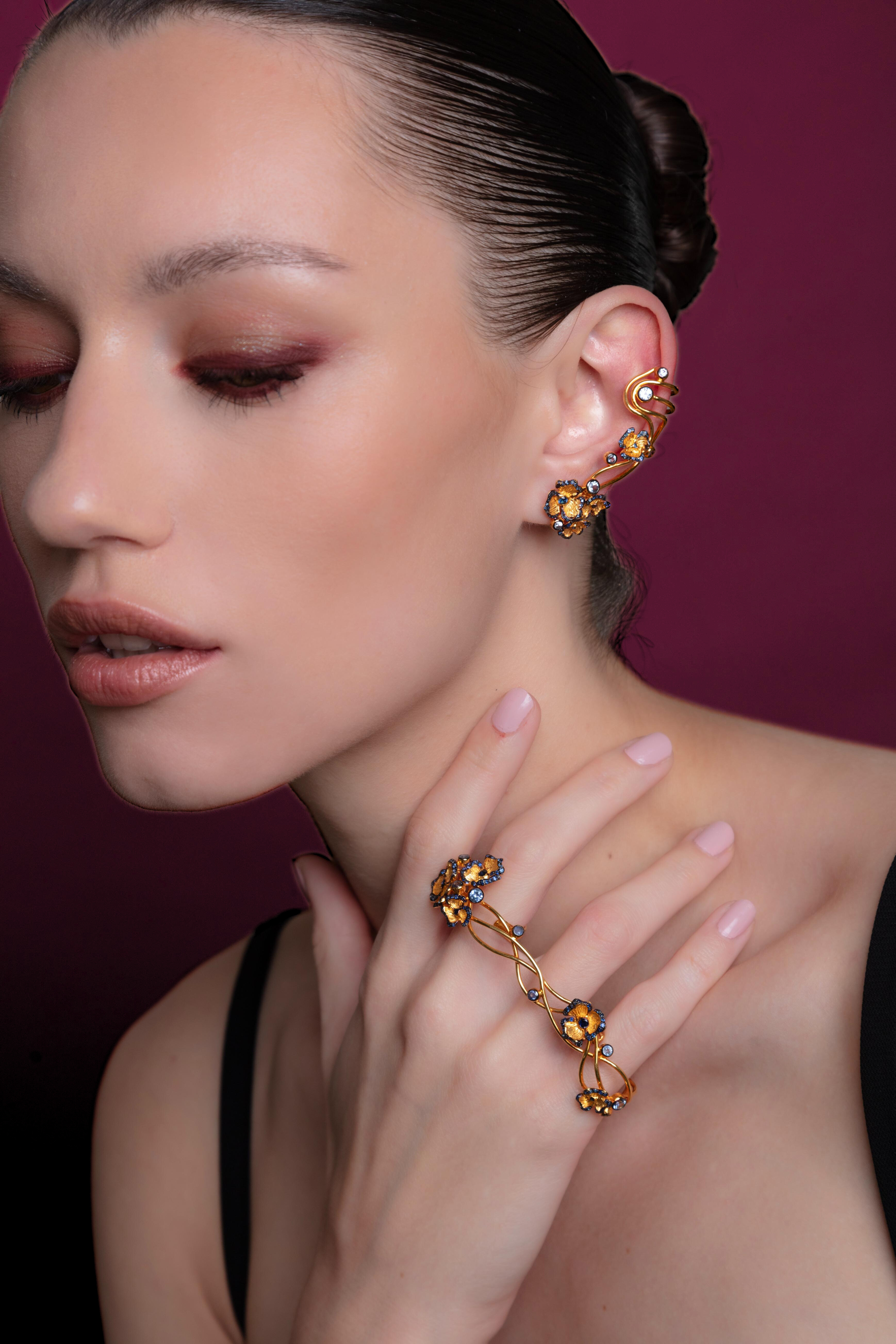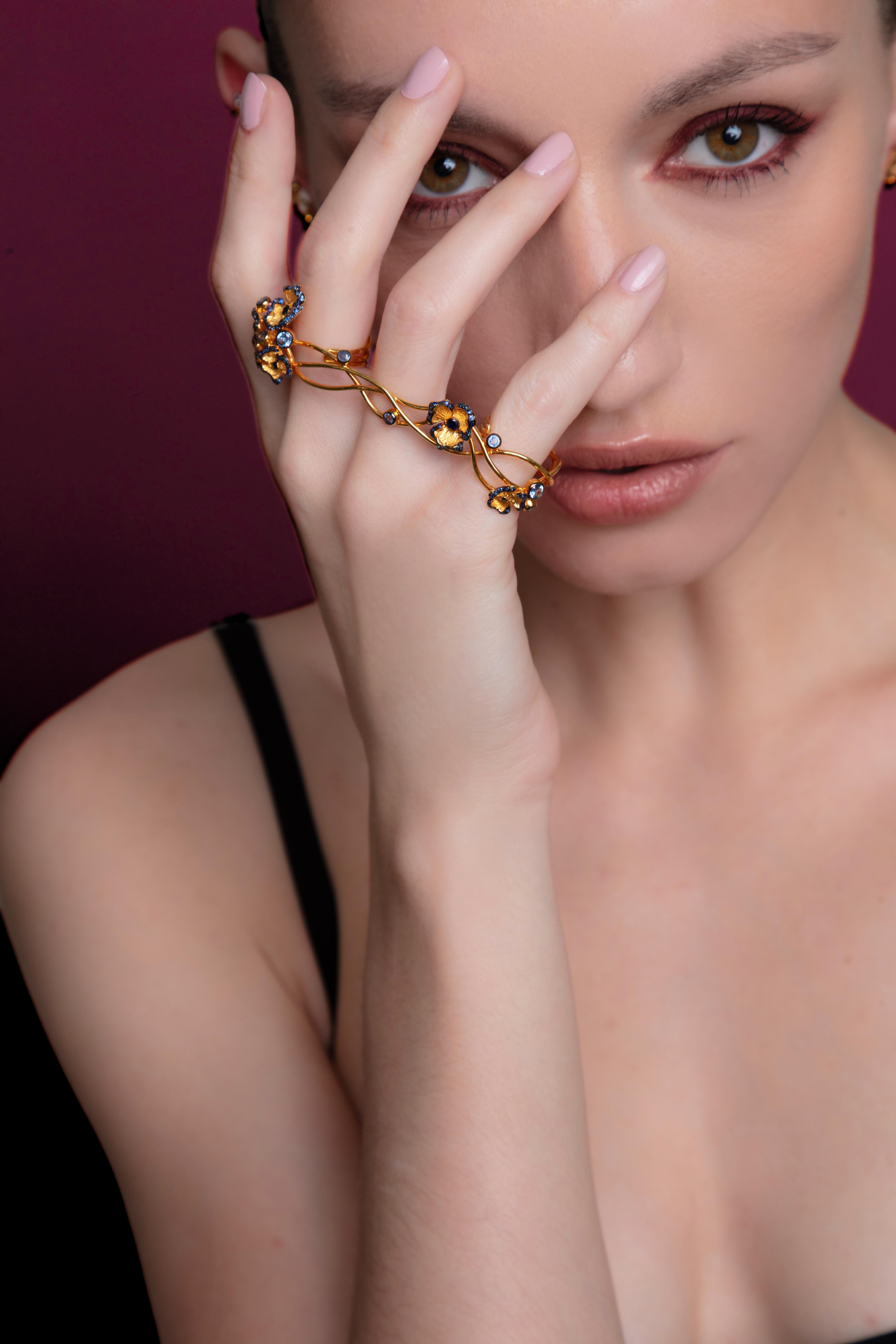 Elevate your style with our "Alia" Double Ring. Crafted in luxurious 18k gold, this ring features delicate sapphire flowers for a touch of elegance. Wear it as a striking double finger ring for a unique and chic look.