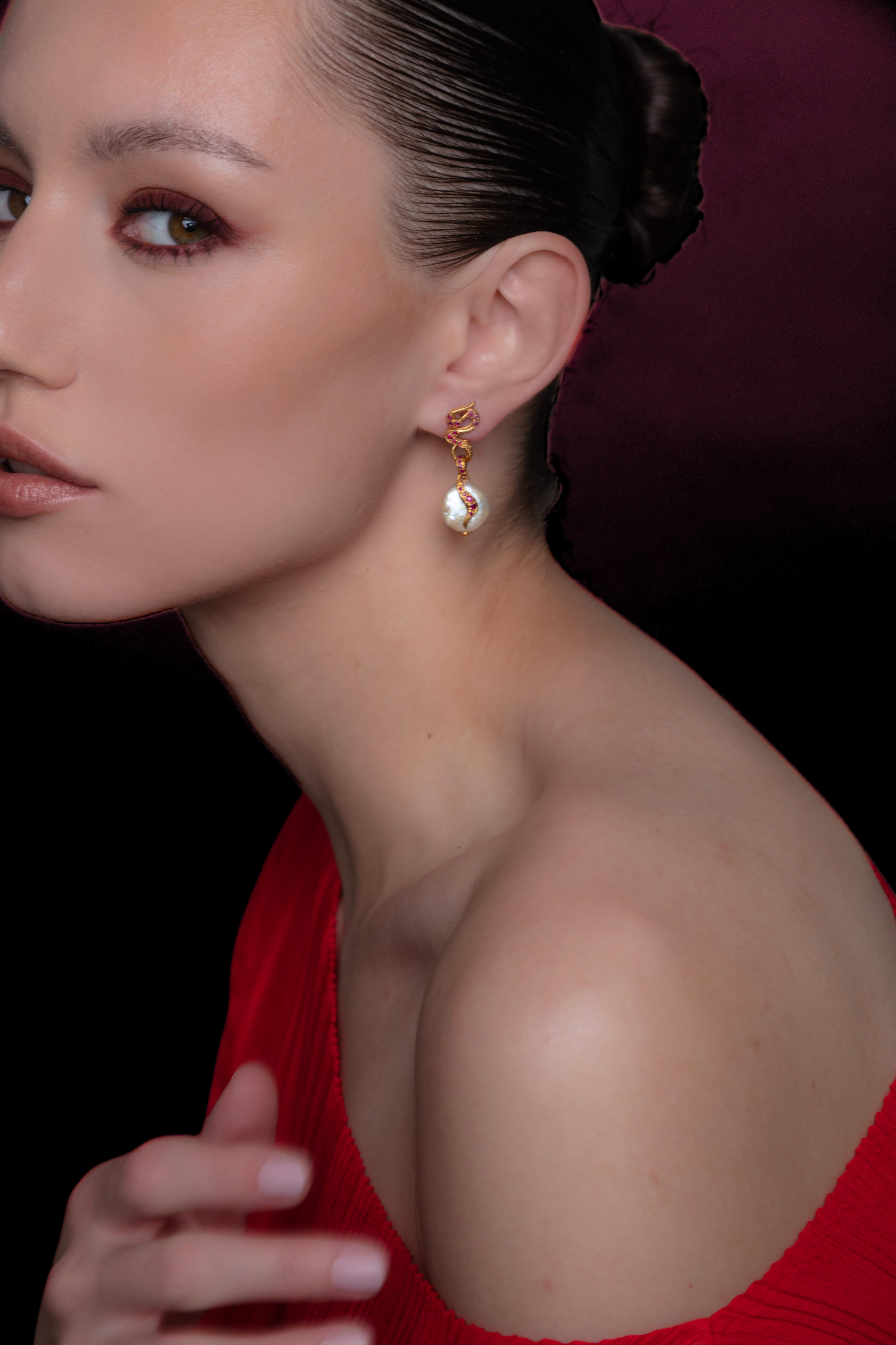 Elevate your summer vibe with Kea, our exquisite earrings that exude elegance and sophistication. Made with baroque pearls and set in a yellow gold base, these fine jewelry pieces are adorned with vibrant rubies.