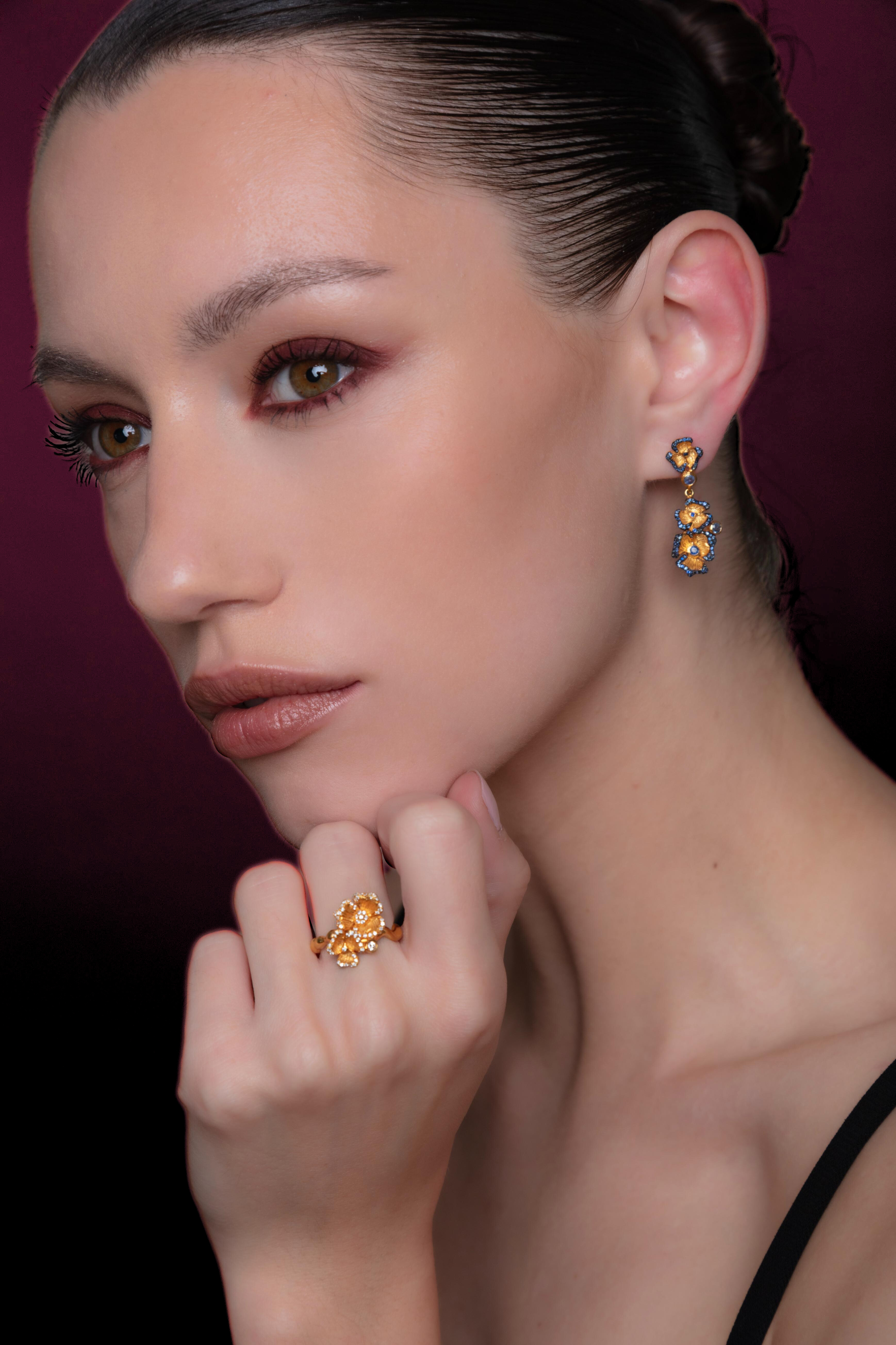 Elevate your style with the Mina Ring. Crafted in 18kt gold, this luxurious ring features stunning floral designs adorned with diamonds. Make a statement with this fashion-forward and elegant piece of jewelry.